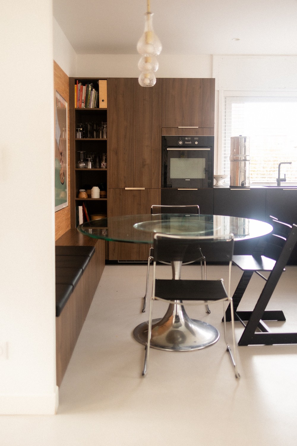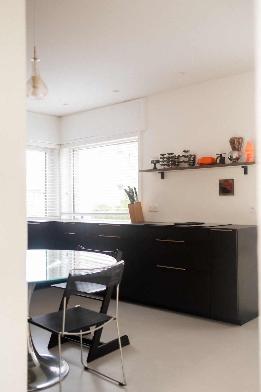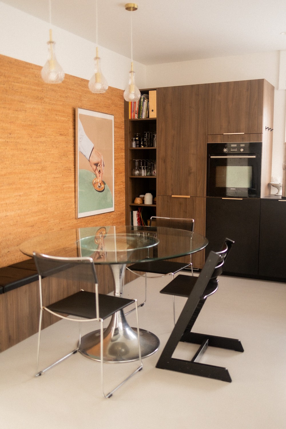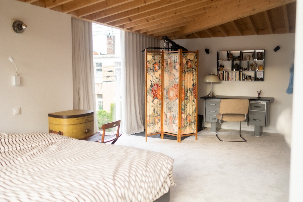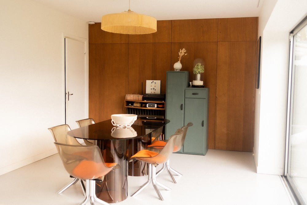 Chaque détail du lieu témoigne d’une passion pour le design vintage, l’artisanat et l’architecture. Les espaces de vie ouverts et chaleureux, comme le salon de 30 m² ou la cuisine contemporaine, sont enrichis par des matériaux bruts et nobles : bois naturel, béton ciré, carrelage mosaïque. Les pièces sont meublées avec goût : fauteuils en velours côtelé, table en verre fumé, chaises Tulip transparentes. On y retrouve aussi une collection de vaisselle rétro et des pièces de céramique uniques, réalisées dans l’atelier situé au fond du jardin arboré de 592 m².
