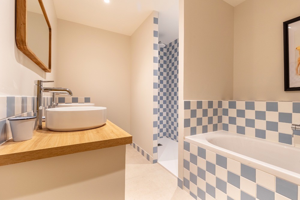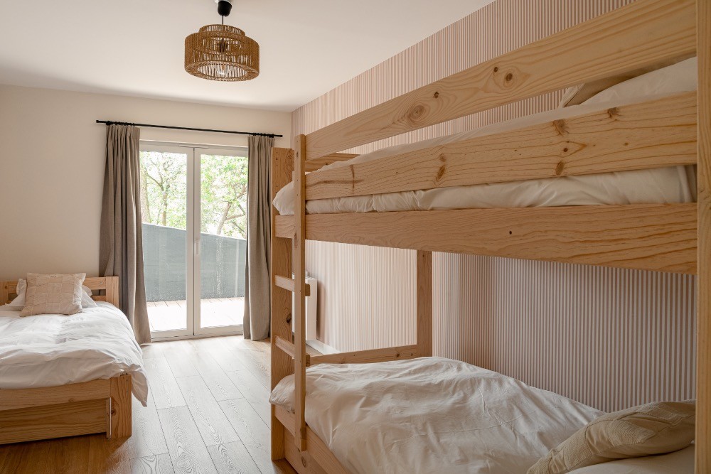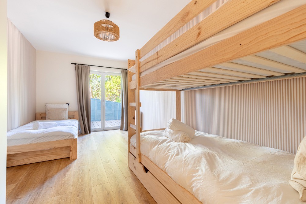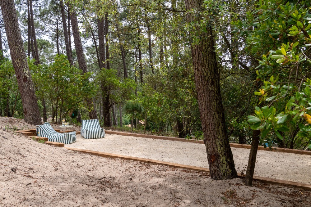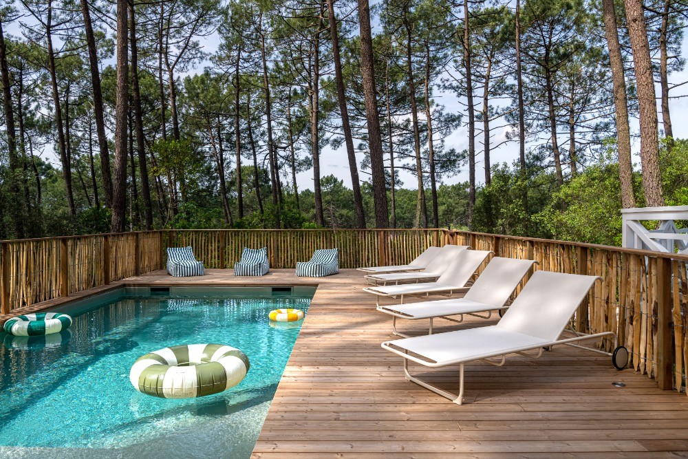 À l’extérieur, la terrasse en bois dialogue avec la piscine et la douche outdoor. Le cadre forestier assure calme et maîtrise sonore, atouts précieux pour un tournage vidéo ou une réunion créative. Les espaces circulent naturellement entre intérieur et extérieur, facilitant la mise en scène de campagnes famille, bien-être ou prêt-à-porter.
