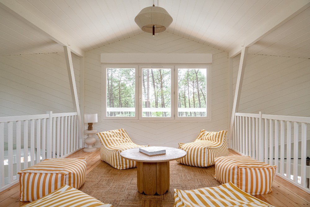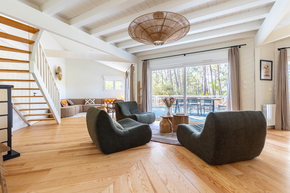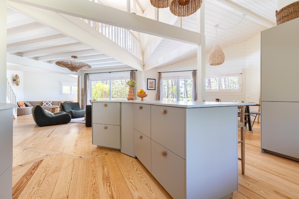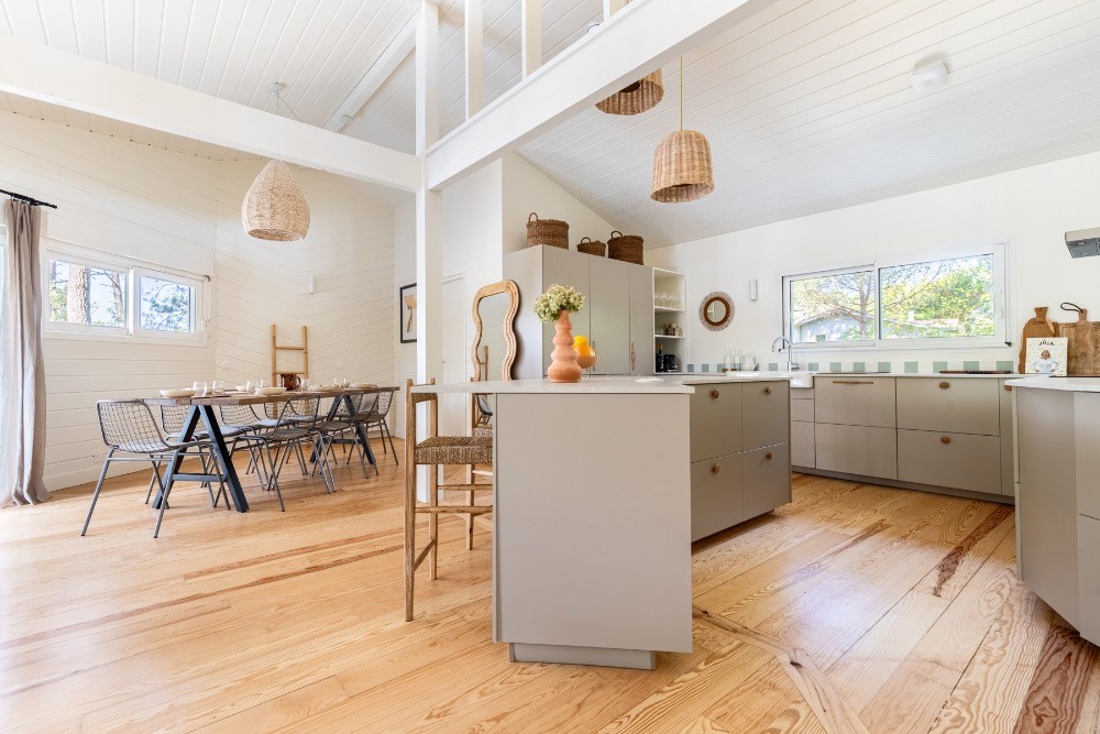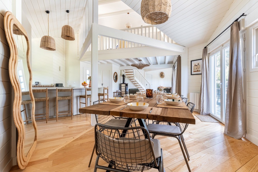 Dès l’entrée, les volumes impressionnent. Le plafond cathédrale, les poutres apparentes et le vide sur séjour créent une respiration architecturale rare. La grande pièce de réception de 65 m² réunit cuisine, salle à manger et salon dans une configuration ouverte idéale pour les équipes de production. La lumière naturelle traverse les baies vitrées et offre un rendu zénithal parfaitement exploitable en publicité, en mode ou en mobilier. Les sols en parquet bois, les murs en bois peint blanc et les touches vert profond composent une atmosphère chaleureuse, élégante, résolument balnéaire.