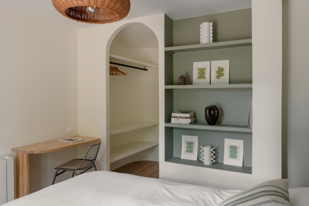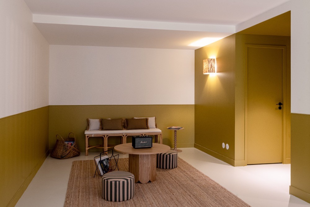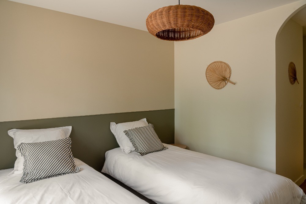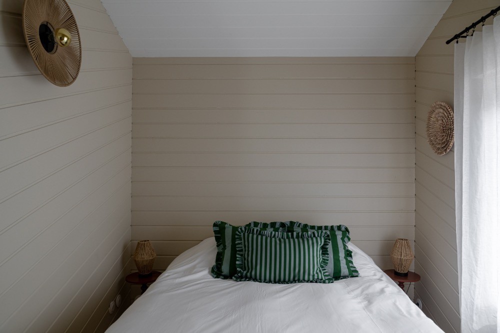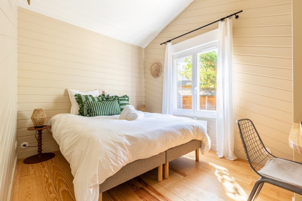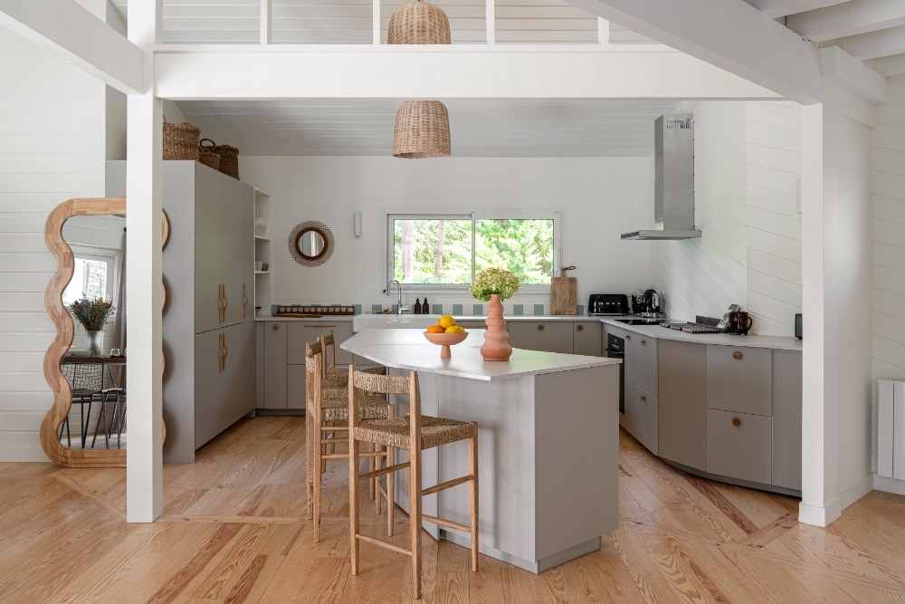 Dès l’entrée, les volumes impressionnent. Le plafond cathédrale, les poutres apparentes et le vide sur séjour créent une respiration architecturale rare. La grande pièce de réception de 65 m² réunit cuisine, salle à manger et salon dans une configuration ouverte idéale pour les équipes de production. La lumière naturelle traverse les baies vitrées et offre un rendu zénithal parfaitement exploitable en publicité, en mode ou en mobilier. Les sols en parquet bois, les murs en bois peint blanc et les touches vert profond composent une atmosphère chaleureuse, élégante, résolument balnéaire.